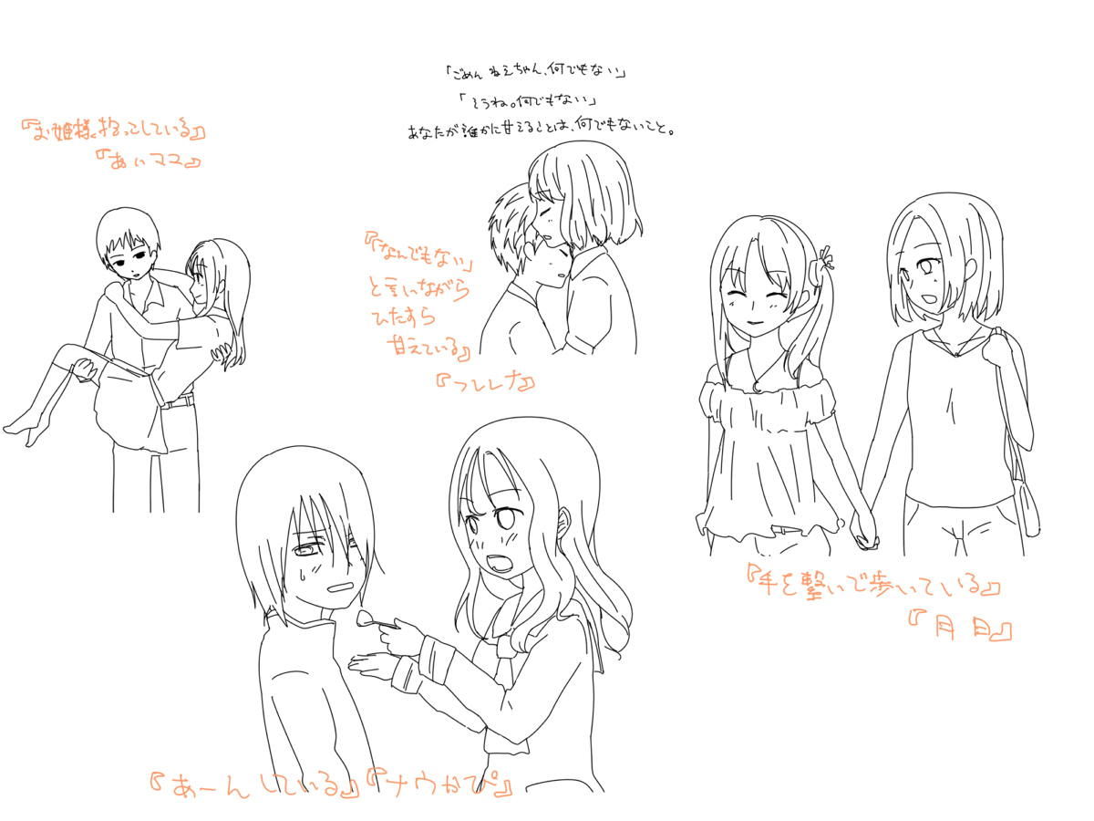 『あーんしている』『ナウかぴ』、 『手を繋いで歩いている』『月日』、 『「なんでもない」と言いながらひたすら甘えている』『フレレナ』、 『お姫様抱っこしている』『あいマユ』が出たからとりあえず全部挑戦してみる。 http://bit.ly/9TF3Xu #sweetCP
